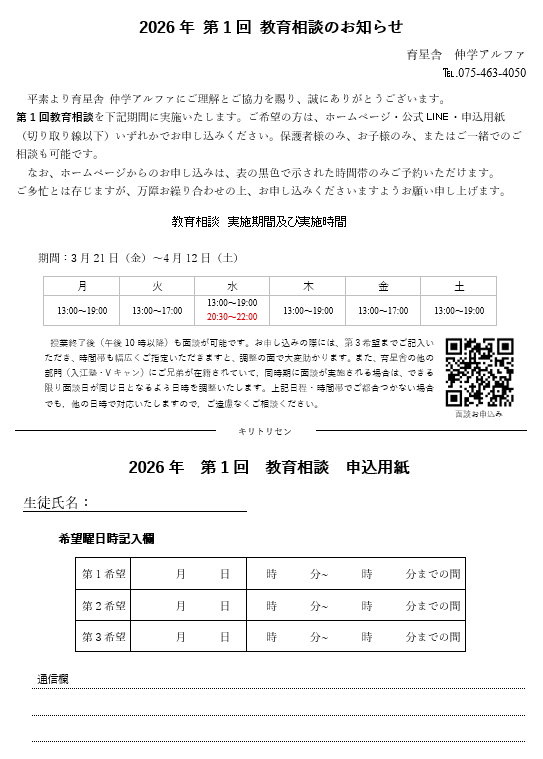誠にありがとうございます。第1回教育相談を下記期間に実施いたします。