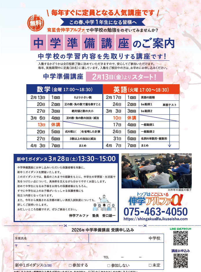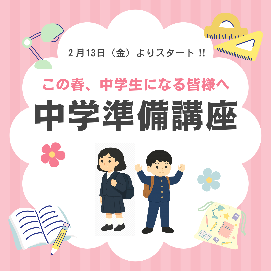 中学準備講座 2026のご案内 お知らせ 2025.11.242025.12.04 伸学アルファ塾長~今春、中学生になる皆様へ~1ヶ月たっぷりの体験講座です。1学期中間テストの内容まで進みます。一足先に中学の授業をのぞいてみませんか?